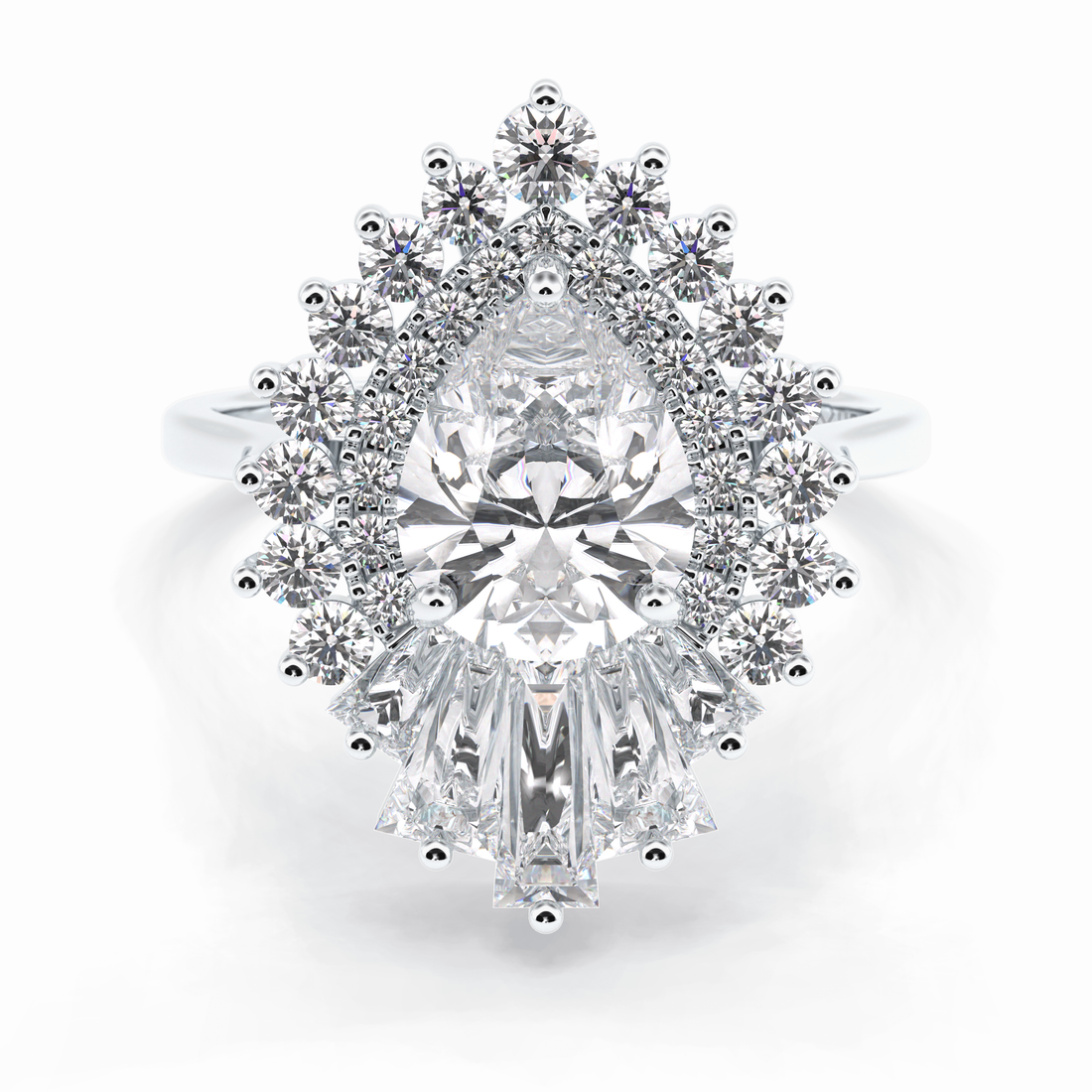 Radiating brilliance, the Sunburst Majesty Pear Halo Ring captures attention with its stunning 1.65-carat pear-shaped...