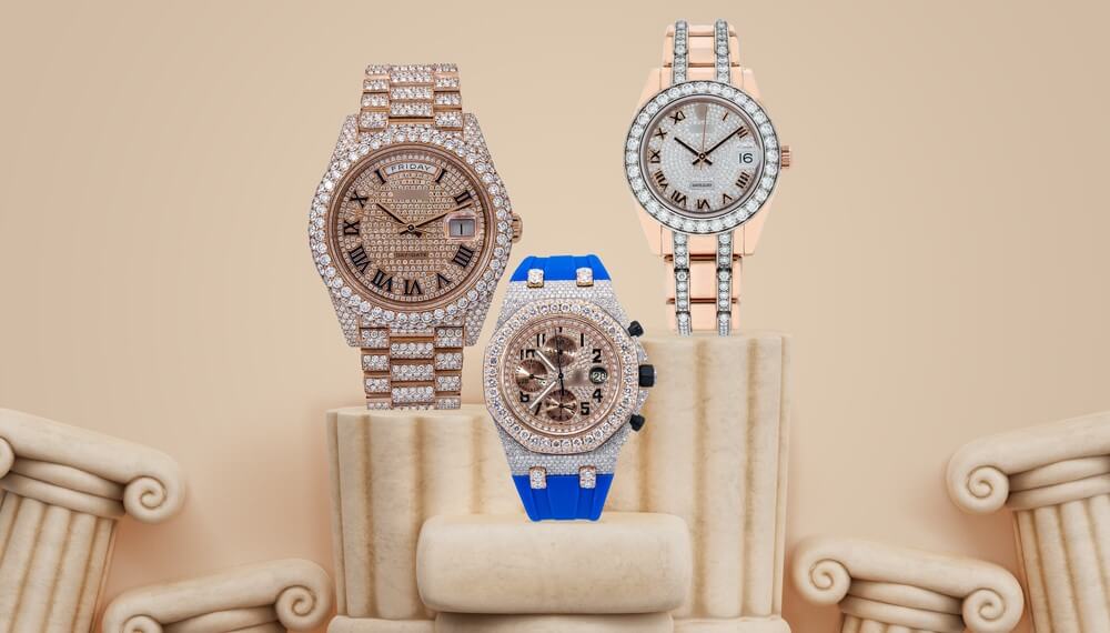 3. Iced Out Watches: An iced-out watch contains multiple Moissanite embellishments, giving it a bold outlook. For anyone who is into streetwear fashion, pieces in this category are a good fit.